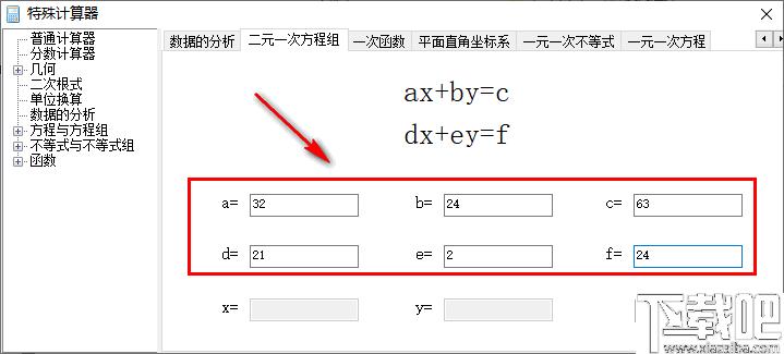 4、比如要计算机二元一次方程,切换到该窗口后您可以看到二元方程的公式。