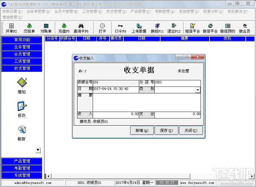 飞跃服饰店管理软件是一套专门为服饰店设计的集现金业务管理、会员卡消费、产品销售、会员管理、短信平台、员工管理、工资管理、收支管理、仓库管理、考勤管理等功能的综合性管理系统。系统集合了全国大量大中型服饰店的先进管理方法,同时结合中国服饰店网在会员卡管理方面的经验,让您轻松解决服饰店在业务管理、质量跟踪、员工考核、业绩分析等一系列问题,迅速提高服饰店经营管理水平、稳固客户群,增加经济效益,是一套以最小的投资获得双盈的优秀管理软件。